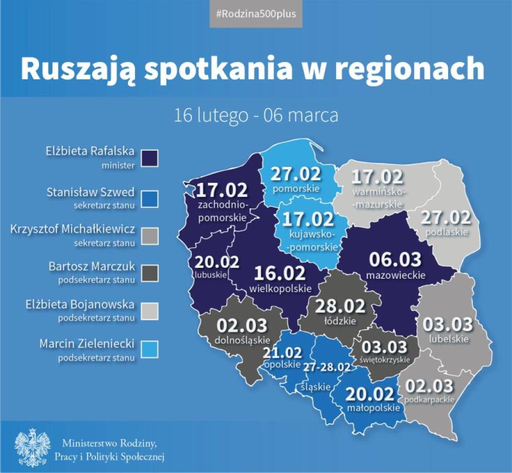 Spotkania zostaną poświęcone m.in. przeglądowi funkcjonowania rządowego programu „Rodzina 500 plus” i wnioskom z niego płynącym. Pierwsze spotkanie odbyło się 16 lutego w Urzedzie wojewódzkim w Poznaniu.
