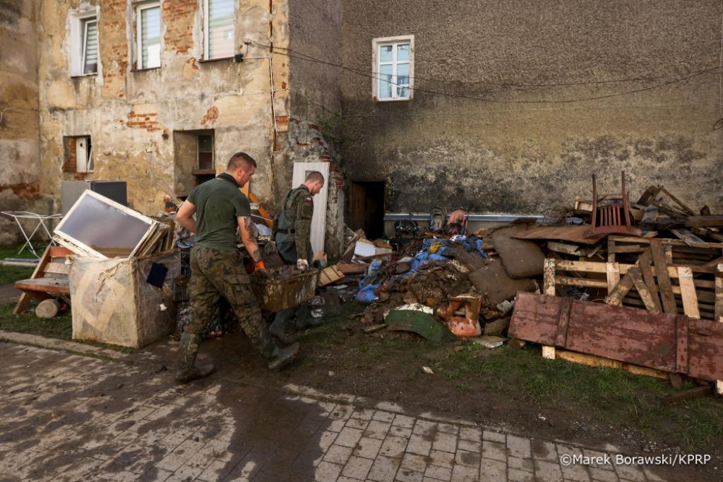 – Fala powodziowa pozostawiła ogromne zniszczenia: wielotonowe zwały gruzu, zgliszcza mułu, szlamu, strat w mieniu, które w zasadzie mogą być usunięte tylko przy użyciu ciężkiego sprzętu. Niemal połowa mieszkańców gminy odcięta jest od bieżącej wody, od prądu. Usunięcie tych strat spowodowanych przez powódź jest tu w zasadzie niemożliwe tylko z wykorzystaniem lekkich środków, jakimi dysponują Wojska Obrony Terytorialnej czy Ochotnicze Straże Pożarne – mówił Szef BBN.