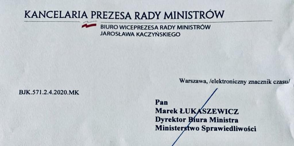 - W piśmie o sygnaturze BJK.572.2.4.2020 MK czytamy, że biuro wicepremiera Jarosława Kaczyńskiego przekazuje do biura Ministra Sprawiedliwości wniosek o nadzór nad sprawą Tomasza K. Zwraca się też o dokonanie analizy sprawy i przekazanie ustaleń do biura wicepremiera.