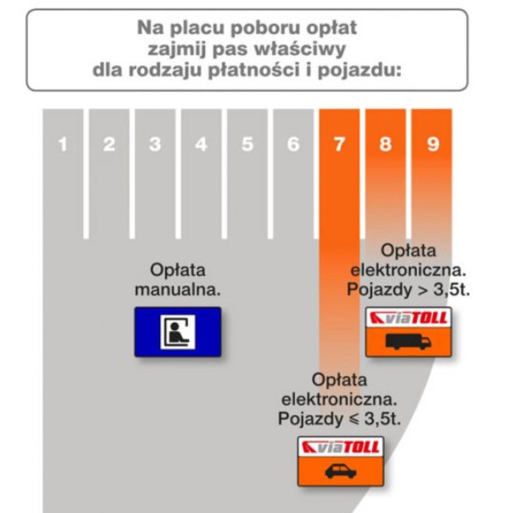 - W miejscach poboru opłat, na odcinkach autostrad Konin-Stryków (A2) i Wrocław-Sośnica (A4) wyznaczone zostały pasy przejazdowe dedykowane dla użytkowników systemów e-TOLL, viaTOLL oraz spersonalizowanych urządzeń pokładowych viaAUTO.
